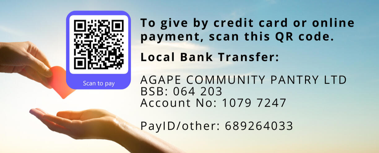 Agape Community Pantry Ltd is a registered charity endorsed as a Deductible Gift Recipient (DGR). Donations of $2 or more are tax-deductible in Australia.🤝 Volunteer Your Time